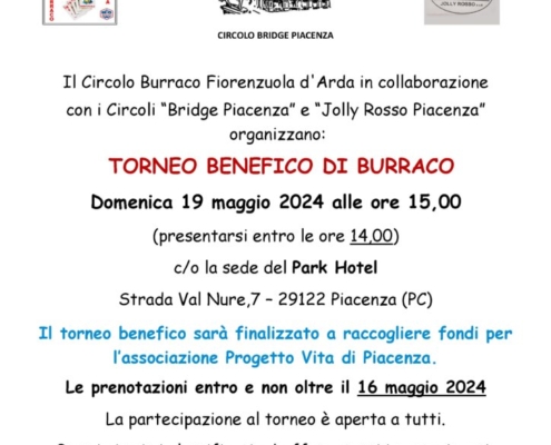 Carrisimi, vi presentiamo questa simpatica iniziativa dedicata agli amanti del gioco del Burraco. Si tratta di un torneo a coppie che si svolgerà Domenica 19 Maggio a partire dalle ore 15:00 presso Park Hotel di Piacenza.