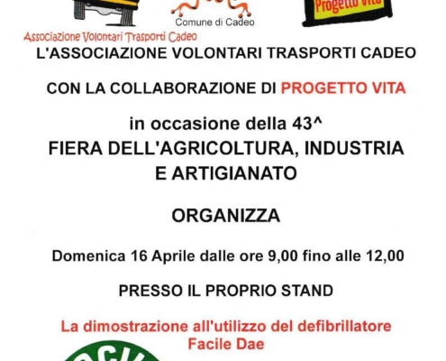 L'ASSOCIAZIONE VOLONTARI TRASPORTI CADEO CON LA COLLABORAZIONE DI PROGETTO VITA in occasione della 43A FIERA DELL'AGRlCOLTURA, INDUSTRIA E ARTIGIANATO ORGANIZZA Domenica 16 Aprile dalle ore 9,00 fino alle 12,00 PRESSO IL PROPRIO STAND  La…