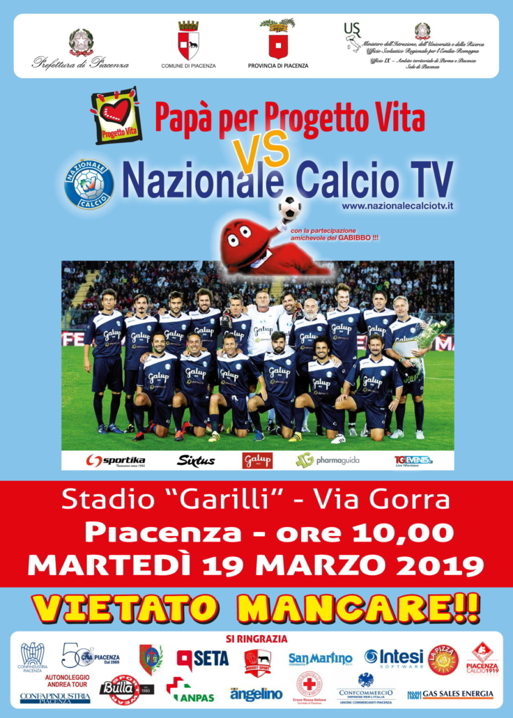 Un grande evento a cui non potete mancare. La nazionale Calcio TV sarà a Piacenza in occasione della frsta del papà, Martedì 19 Marzo presso lo stadio Garilli in Via Gorra.
